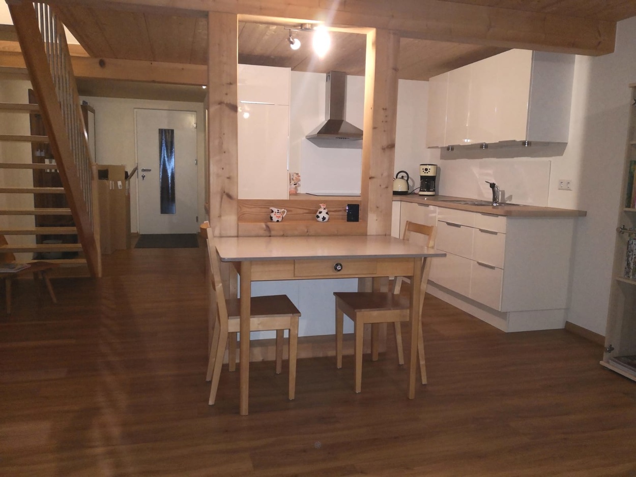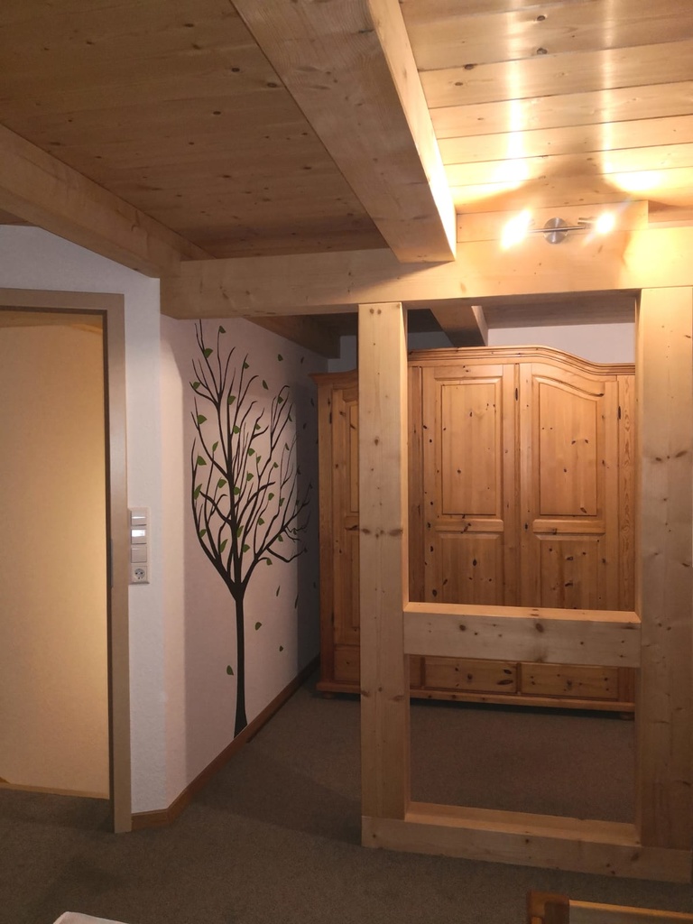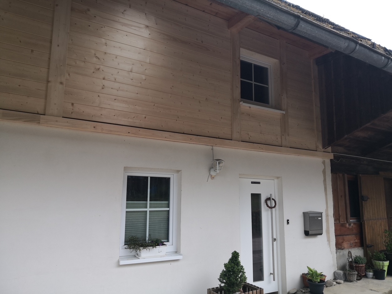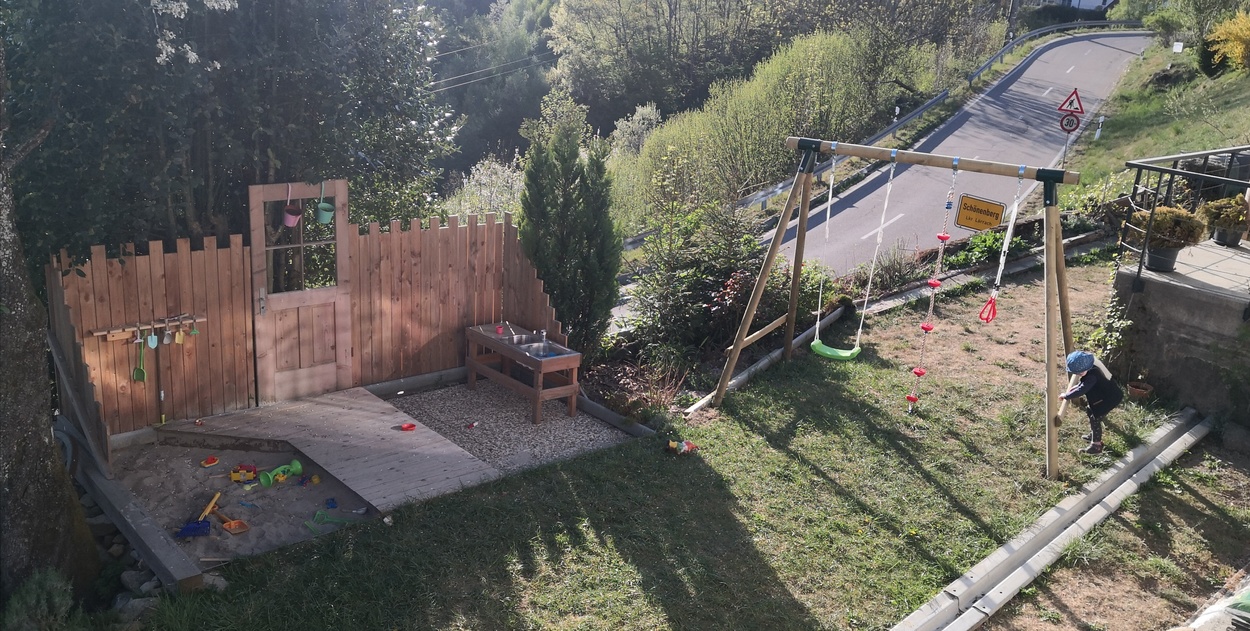 Außenansicht des Hauses mit Garten  - Eingangstür der Ferienwohnung  - Küchenecke und Esstisch mit zwei Stühlen - Kochnische mit Herd, Backofen und Spülbecken - Blick durch Holzbalken, als Raumteiler, auf einen großen Holzschrank  - Badezimmer mit Eckdusche, Waschbecken und Toilette sowie einem Fenster  - Spielecke im Garten mit Schaukel und Spielküche  - Doppelbett  -
