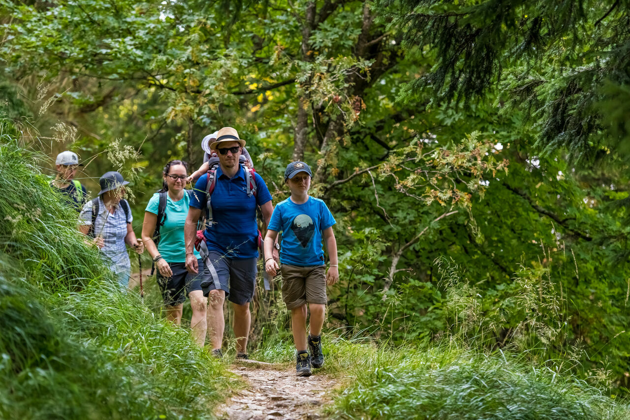 Nach einer weiteren Nacht inmitten einer faszinierenden Berglandschaft und geprägt von der Stille auf über 1.100 Metern, machen wir uns nach dem Frühstück auf zu unserer vierten Etappe, die gleichzeitig auch die längste unserer Hüttentrecking Tour im Südschwarzwald ist. Die Route führt uns am heutigen Tag über den aussichtsreichen Wiedener Panoramaweg zur Passhöhe am Wiedener Eck, von wo wir ein Stück dem Westweg bzw. dem Premiumwanderweg Belchensteig folgen. Diesen verlassen wir anschließend an der Krinne, unterhalb des Belchens, um in Richtung Untermulten und unserem heutigen Tagesziel, der Dießlin Hütte, zu wandern. Die Selbstversorgerhütte hat 24 Stunden am Tag geöffnet und kann somit zu jeder Uhrzeit aufgesucht werden. Ein Wanderzimmer mit vier Betten ist auch im Falle einer Gruppennutzung für Wanderer reserviert. Der Hüttenschlüssel ist erhältlich beim Schwarzwaldhof Vogt in Untermulten (gemäß Hinweisschild am Wanderheim). In unmittelbarer Nähe befindet sich das Gasthaus Belchen-Multen sowie ca. 500 Meter entfernt das Belchenhotel Jägerstüble. In beiden Gasthäusern kann auf Voranmeldung gefrühstückt werden. Ebenfalls empfangen Sie die beiden Wirte-Familien gern zum Abendessen. Nach einer erholsamen Nacht und einem reichhaltigen Frühstück schnüren wir die Wanderschuhe und verschaffen uns nochmal kurz einen Überblick über die heutige Tour auf unserer Wanderkarte. Dann geht es los. Die ersten Meter führen uns zurück zum Abzweig Knöpflesbrunnen, unmittelbar an die Stelle, an der wir am gestrigen Tage aus dem Wald hervorgetreten sind und der Wiesenpfad anschließend in den breiten Wanderweg überging. Nun halten wir uns nicht wie am Vortag links. Stattdessen gehen wir auf dem breiten Wanderweg weiter. Wir folgen hierzu der Beschilderung in Richtung Hasbacher Höhe, Dachsrain, Notschrei und Schauinsland (blaue Raute). Bereits nach 700 Metern ist diese erreicht. Von hier aus haben wir nun zwei Möglichkeiten zum Dachsrain zu gelangen. Entweder wir nehmen den mittleren der drei abzweigenden Wege oder wir halten uns rechts. Wir entscheiden uns für die letztgenannte Variante, schließlich ist dieser Weg bedeutend aussichtsreicher als die Direktverbindung zum Dachsrain, die ausschließlich durch den Wald führt. So aber treten wir schon bald aus dem Wald heraus und haben einen tollen Ausblick über das gesamte Wiedener Tal sowie den dahinterliegenden Belchen, den wir heute noch erreichen möchten.