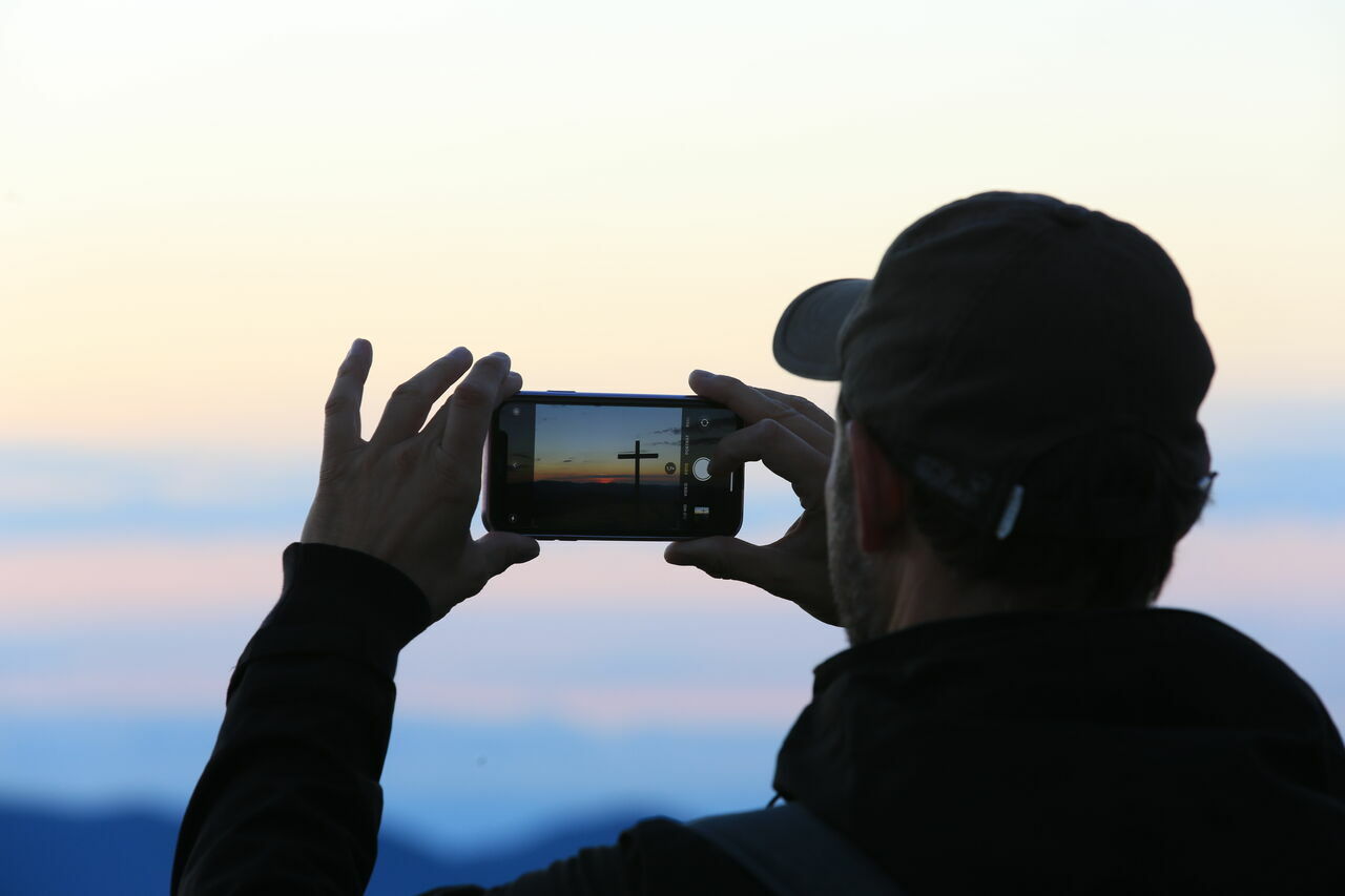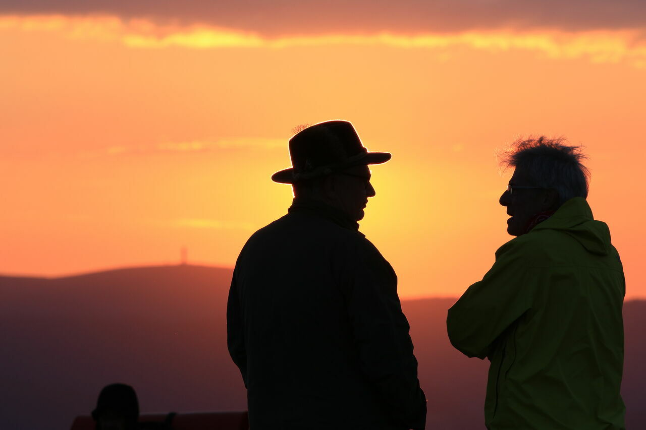 Ein Paar beobachtet den Sonnenaufgang am Belchen.-Unterhaltung zwischen zwei Männern, während im Hintergrund die Sonne aufgeht.Der Rückweg nach dem Sonnenaufgang. Zu sehen ist das Belchenhaus und die Bergstation der Belchen Seilbahn.